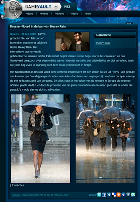 Bedoeling was om “passanten” te fotograferen met een paraplu, waarop “Heavy Rain” – de titel van een nieuw computerspel voor play station – moest te lezen zijn. De passanten moesten door een watergordijn (heavy rain) lopen met de paraplu open en met de tekst naar mij gericht.
