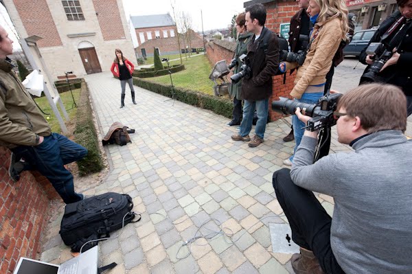 Eens het theoretisch gedeelte voorbij was hebben zijn we met z’n allen naar buiten getrokken, om daar aan de hand van een paar voorbeelden – en de fantastische hulp van onze twee modellen – het werken met reportageflitsen op locatie te illustreren. De foto’s die ik maakte konden ogenblikkelijk bekeken worden op het scherm van mijn laptop, zodat de deelnemers beter konden volgen.